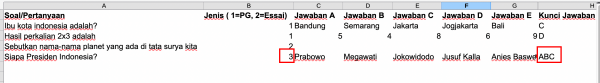 Official e-ujian Bisa kak, import excel bisa untuk tipe PG Satu Jawaban, PG Multi Jawaban dan Essay. Untuk tipe Mencocokkan dan Benar/Salah masih belum. Untuk PG multi jawaban nanti kodenya 3 seperti gambar ini