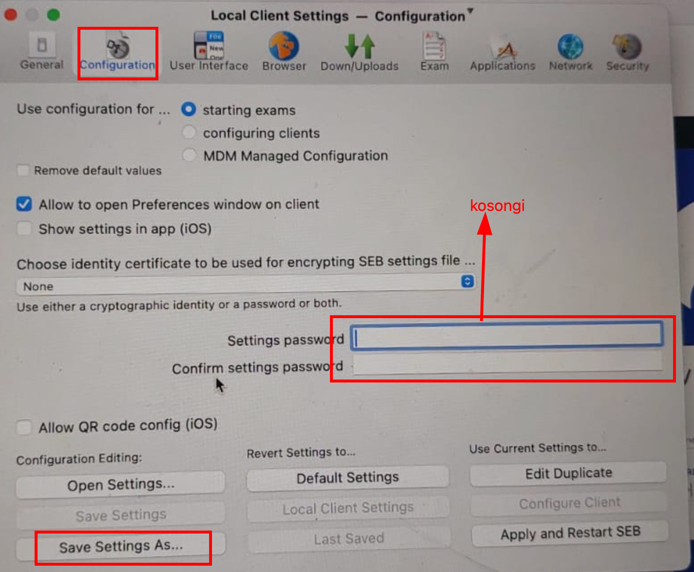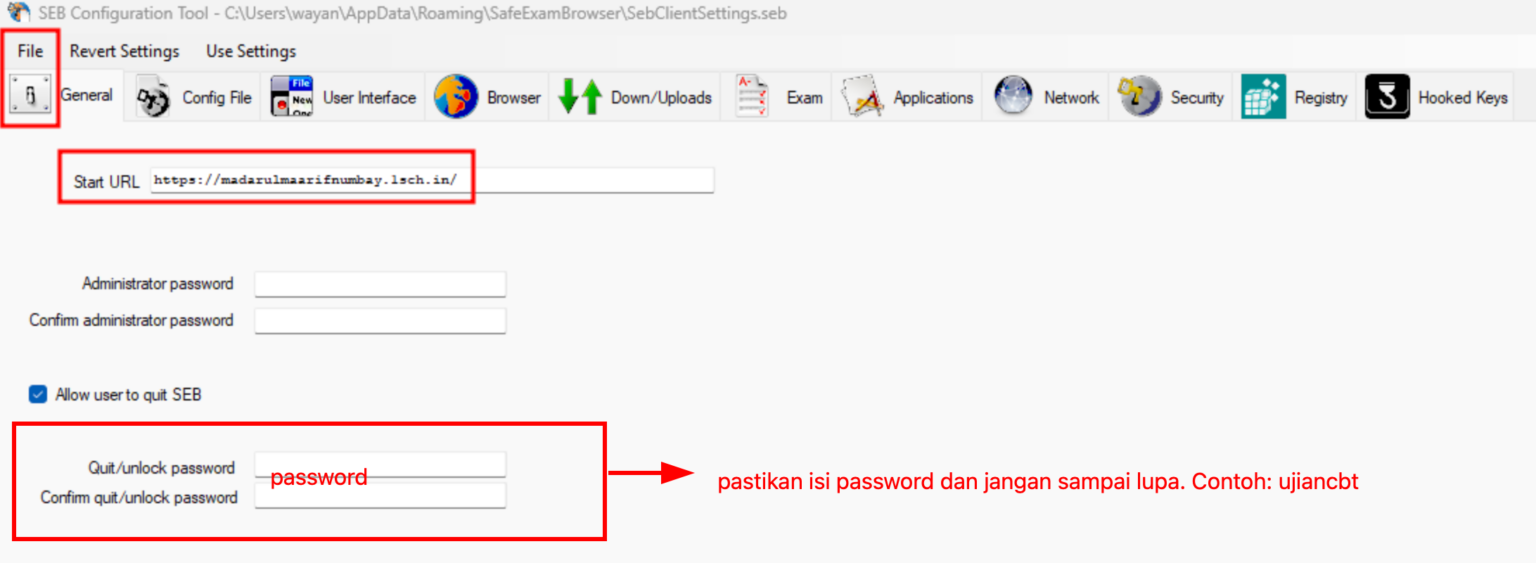 Jadi pertama kakak perlu install dl aplikasi safe exam browser untuk windows atau iphone. Setelah itu, cari dan buka SEBConfigTool.exe dan kemudian buat config seperti ini